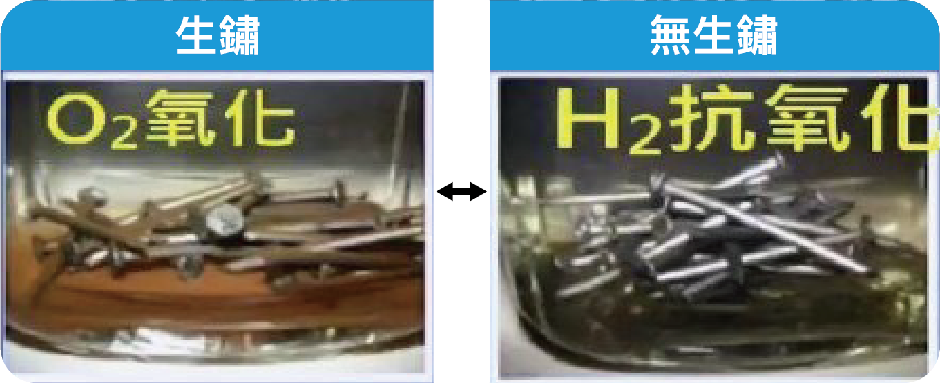 (例3)鐵釘泡在普通的水中漸漸生鏽(左),而泡在水素水中沒有生鏽,潔亮如新(右)