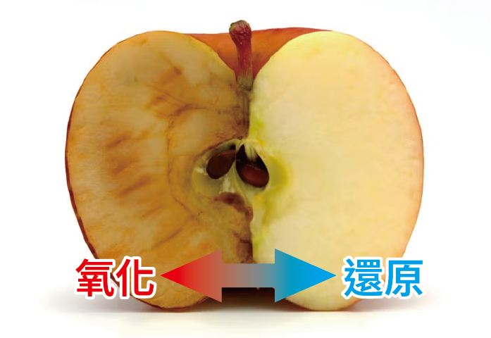 (例1)將半邊蘋果浸泡在水素水中,沒泡水素的半邊已氧化變色,而泡水素的一邊依然鮮脆