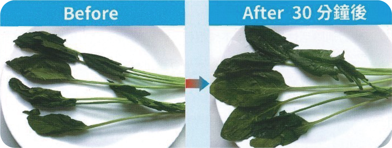(例2) 將萎縮的菜葉在浸泡水素水30分鐘,變得比較翠綠鮮嫩。
