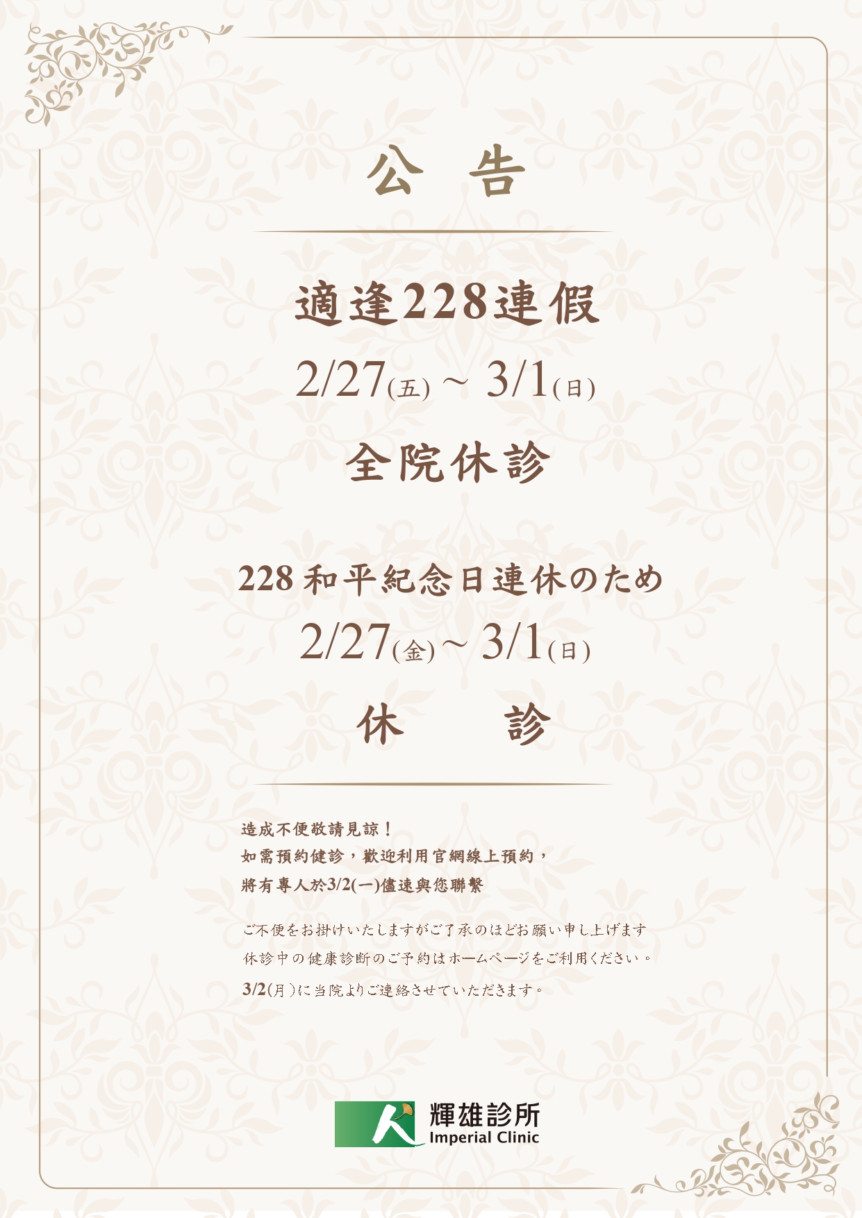 2/27(五) ~3/01(日) 和平紀念日休診公告