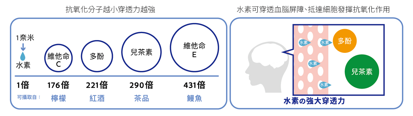 而水素分子大小只有1奈米,是維生素C的1/176、多酚的1/221、兒茶素的1/290、維他命E的1/431。它能順暢到達體內各個器官,穿過細胞膜到達粒線體,並通過血腦屏障到達腦部,發揮氧化還原的作用,這是其他抗氧化劑無法達到的。
