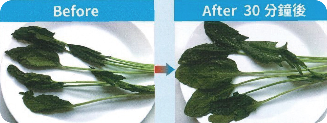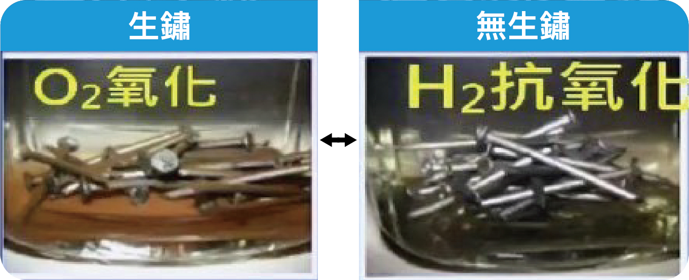 萎縮的菜葉在浸泡水素水30分鐘,變得比較翠綠鮮嫩。(例3)鐵釘泡在普通的水中漸漸生鏽(左),而泡在水素水中沒有生鏽,潔亮如新(右)