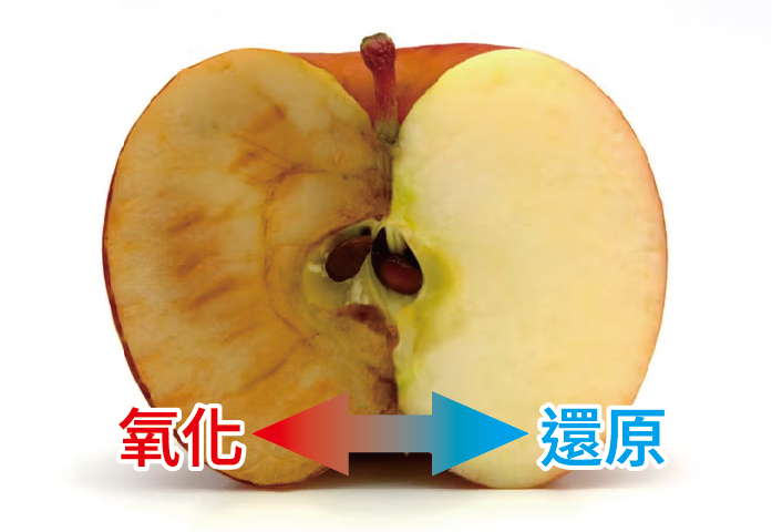 (例1)將半邊蘋果浸泡在水素水中,沒泡水素的半邊已氧化變色,而泡水素的一邊依然鮮脆