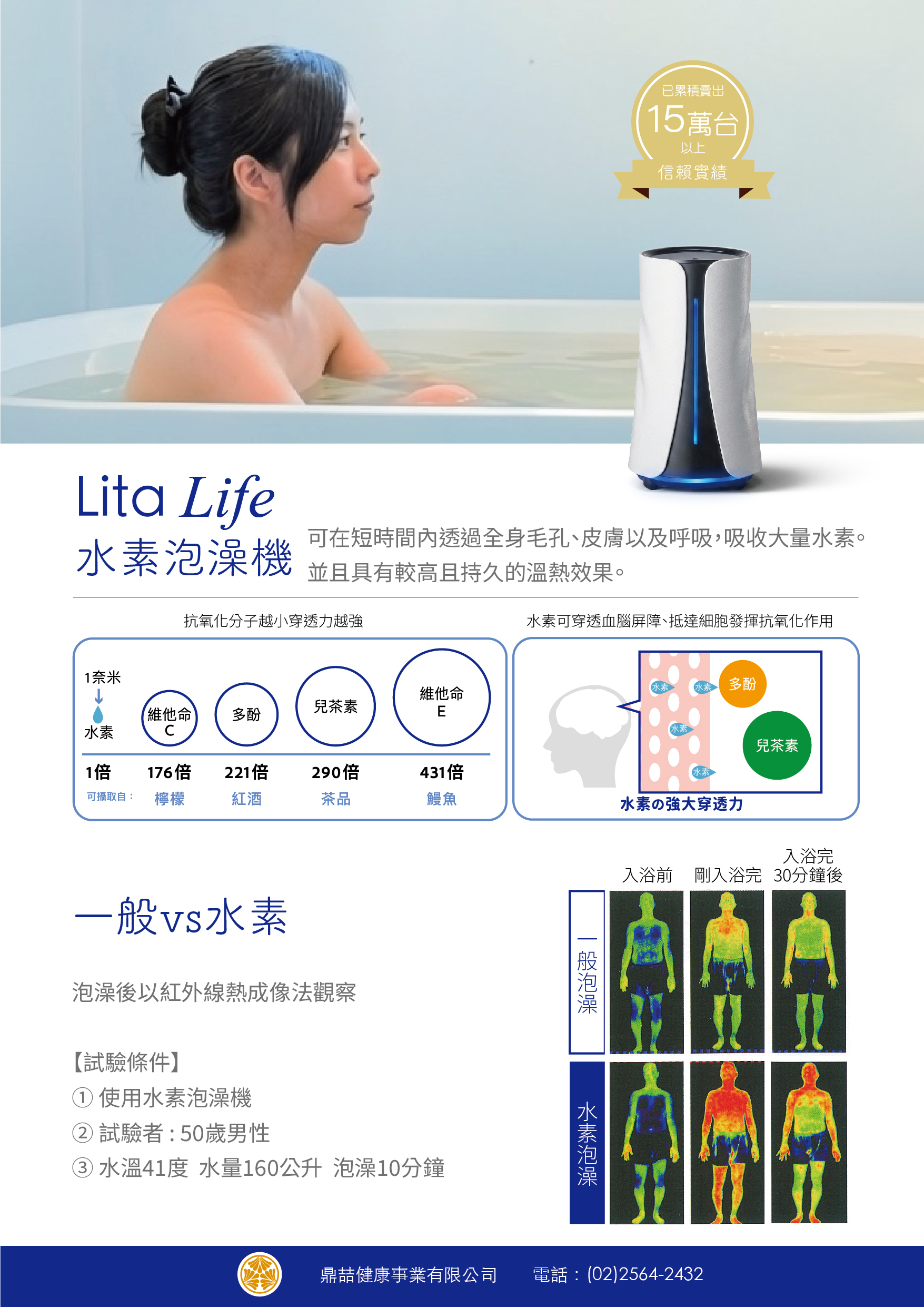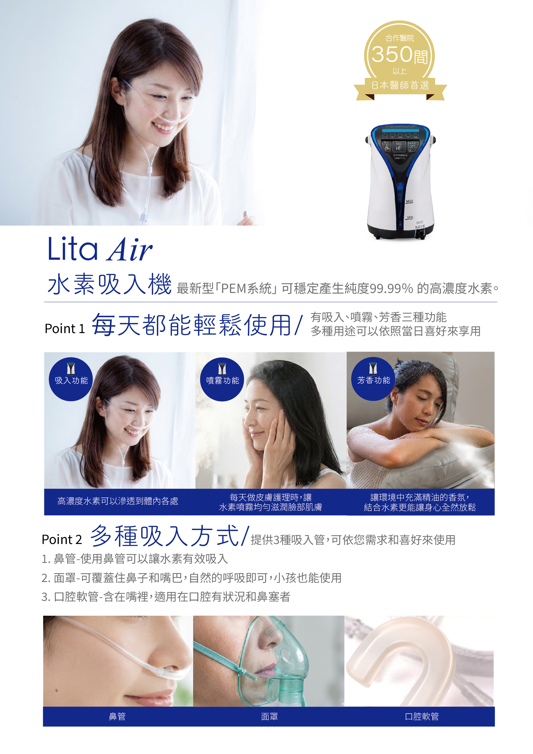本院引進日本醫師信賴首選,合作醫院高達350間以上、銷量15萬台以上的「Lita Air 水素吸入機」及「Lita Life水素泡澡機」,提供您高品質、安全便利的水素保養選擇。